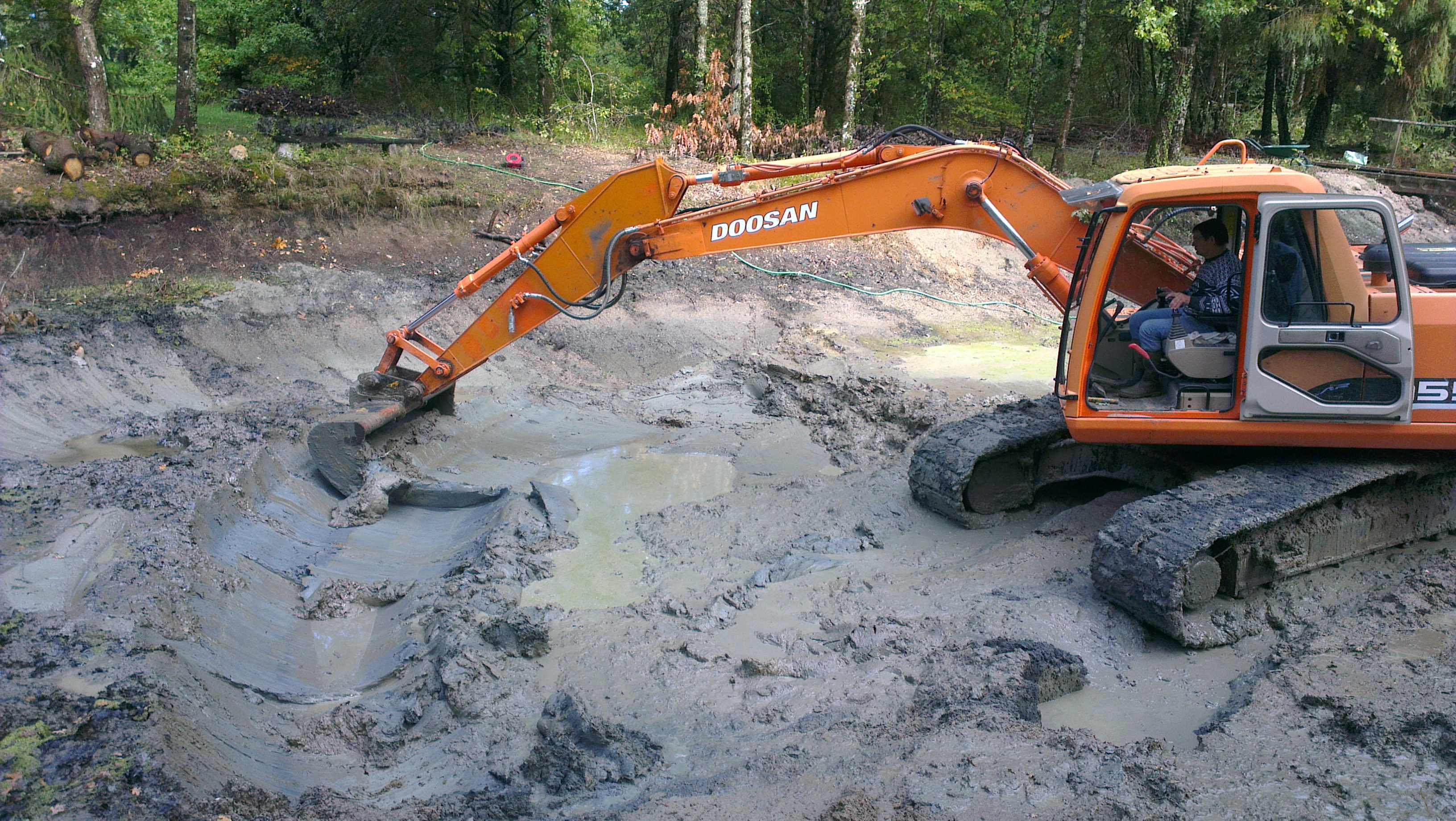 Curage de fossés ou d'étangs. Nous sommes spécialement équipés pour le travail en milieu humide. Des kilomètres de fossés et des hectares d'étangs sont nettoyés chaques années dans notre région par nos soins.